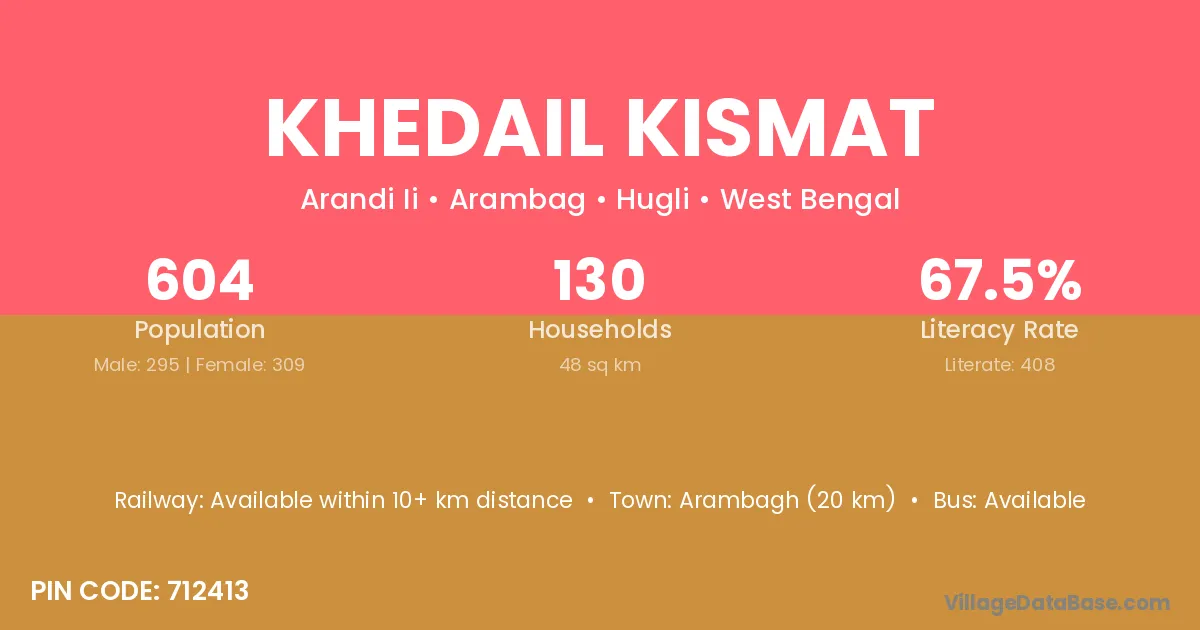 Arambagh (20 km) is the nearest town to Khedail Kismat village for major economic activities and is located approximately 20 km away.