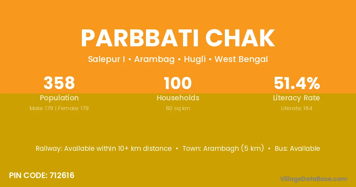Arambagh (5 km) is the nearest town to Parbbati Chak village for major economic activities and is located approximately 5 km away.