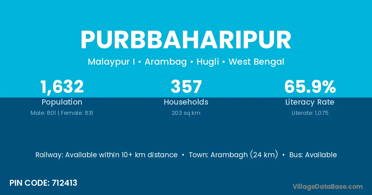Arambagh (24 km) is the nearest town to Purbbaharipur village for major economic activities and is located approximately 24 km away.