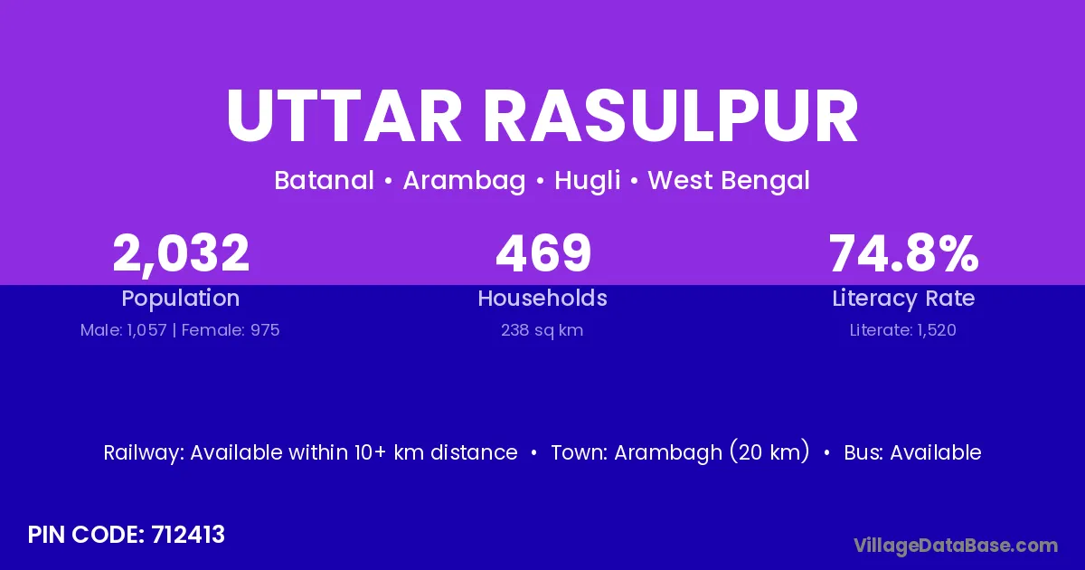 Arambagh (20 km) is the nearest town to Uttar Rasulpur village for major economic activities and is located approximately 20 km away.
