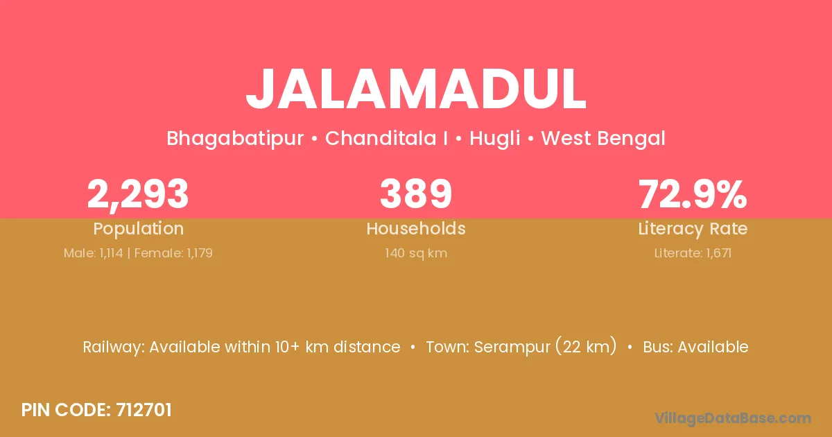 Serampur (22 km) is the nearest town to Jalamadul village for major economic activities and is located approximately 22 km away.