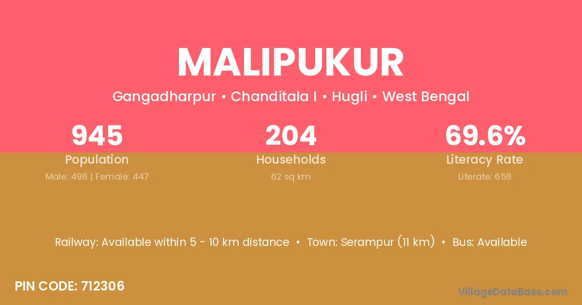 Serampur (11 km) is the nearest town to Malipukur village for major economic activities and is located approximately 11 km away.