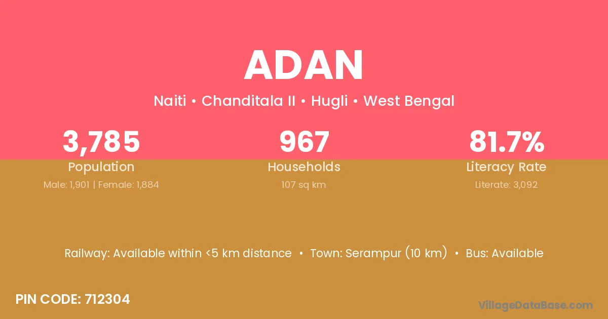 Serampur (10 km) is the nearest town to Adan village for major economic activities and is located approximately 10 km away.