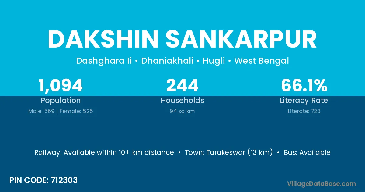 Tarakeswar (13 km) is the nearest town to Dakshin Sankarpur village for major economic activities and is located approximately 13 km away.