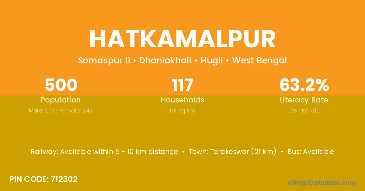 Tarakeswar (21 km) is the nearest town to Hatkamalpur village for major economic activities and is located approximately 21 km away.