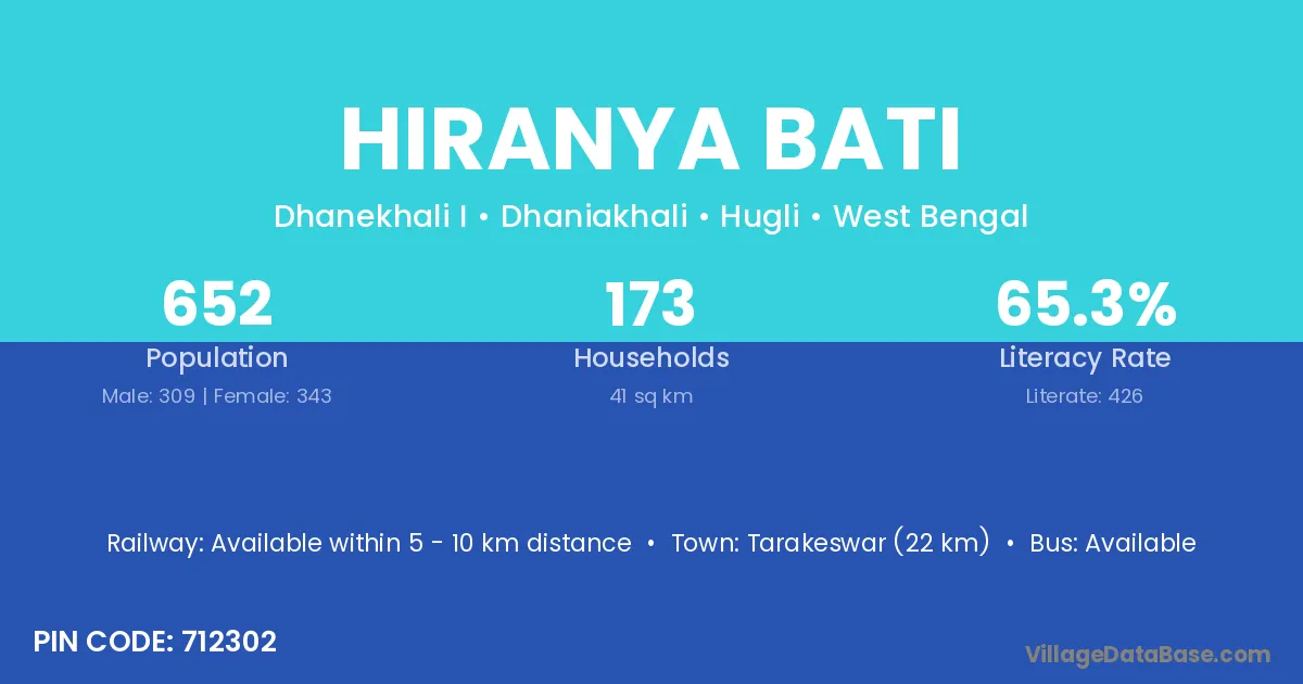 Tarakeswar (22 km) is the nearest town to Hiranya Bati village for major economic activities and is located approximately 22 km away.
