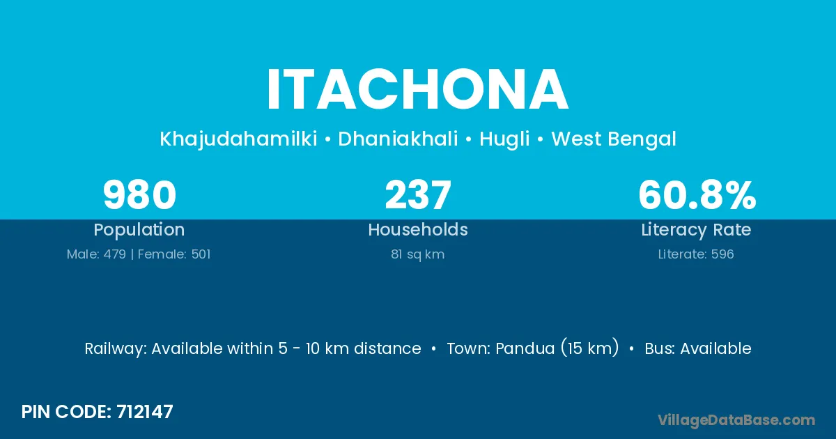 Pandua (15 km) is the nearest town to Itachona village for major economic activities and is located approximately 15 km away.