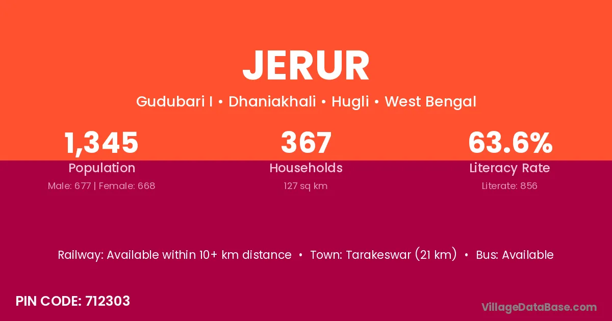 Tarakeswar (21 km) is the nearest town to Jerur village for major economic activities and is located approximately 21 km away.
