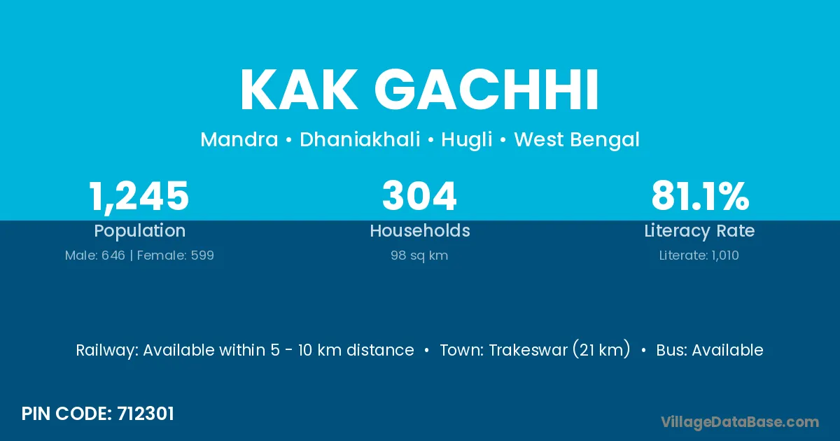 Trakeswar (21 km) is the nearest town to Kak Gachhi village for major economic activities and is located approximately 21 km away.