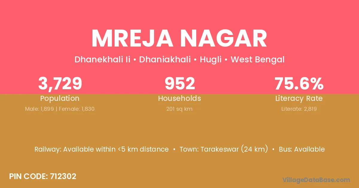 Tarakeswar (24 km) is the nearest town to Mreja Nagar village for major economic activities and is located approximately 24 km away.