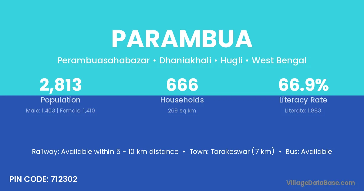 Tarakeswar (7 km) is the nearest town to Parambua village for major economic activities and is located approximately 7 km away.