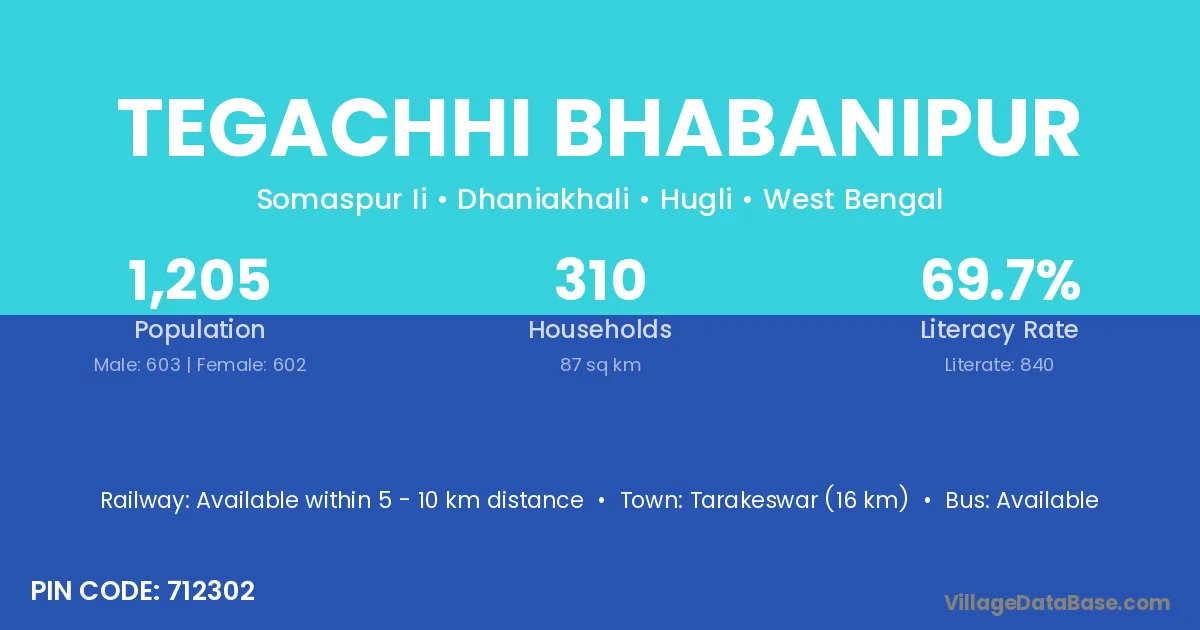 Tarakeswar (16 km) is the nearest town to Tegachhi Bhabanipur village for major economic activities and is located approximately 16 km away.