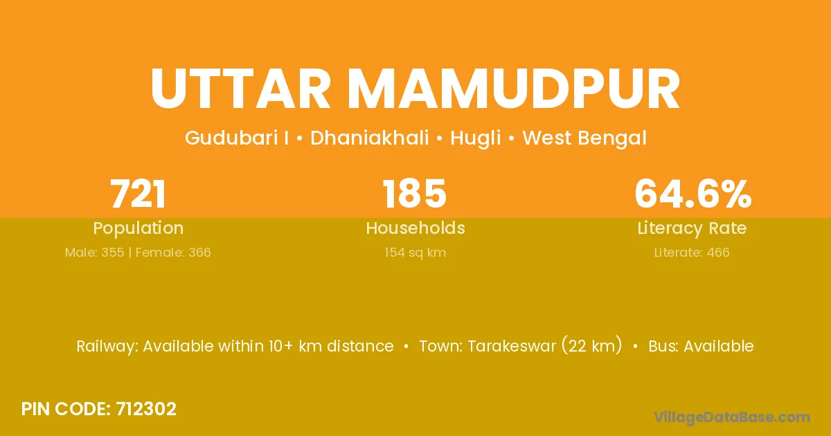Tarakeswar (22 km) is the nearest town to Uttar Mamudpur village for major economic activities and is located approximately 22 km away.