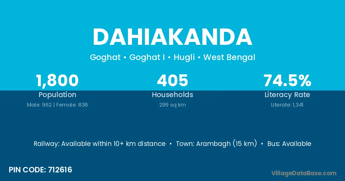 Arambagh (15 km) is the nearest town to Dahiakanda village for major economic activities and is located approximately 15 km away.