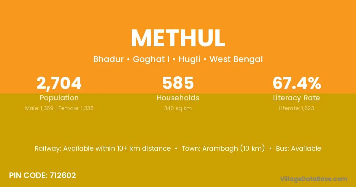 Arambagh (10 km) is the nearest town to Methul village for major economic activities and is located approximately 10 km away.