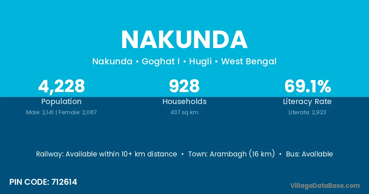 Arambagh (16 km) is the nearest town to Nakunda village for major economic activities and is located approximately 16 km away.
