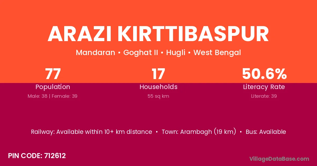 Arambagh (19 km) is the nearest town to Arazi Kirttibaspur village for major economic activities and is located approximately 19 km away.