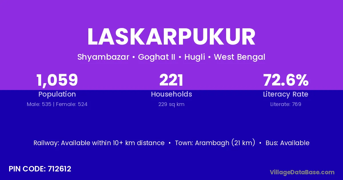 Arambagh (21 km) is the nearest town to Laskarpukur village for major economic activities and is located approximately 21 km away.