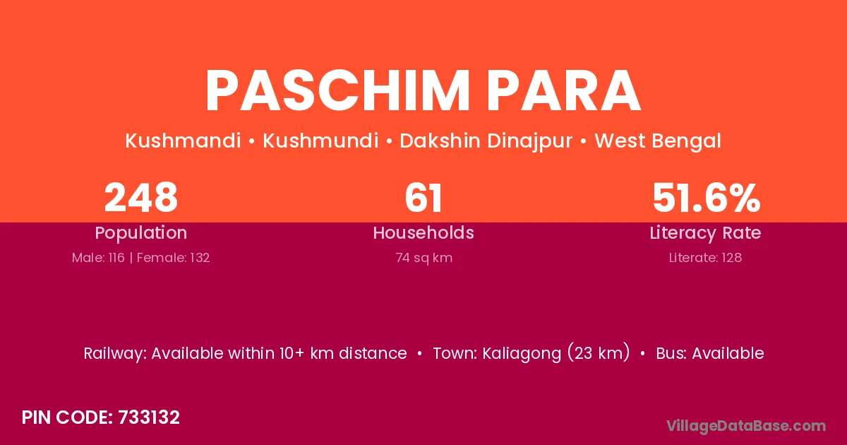 Ramjibanpur (5 km) is the nearest town to Paschim Para village for major economic activities and is located approximately 5 km away.