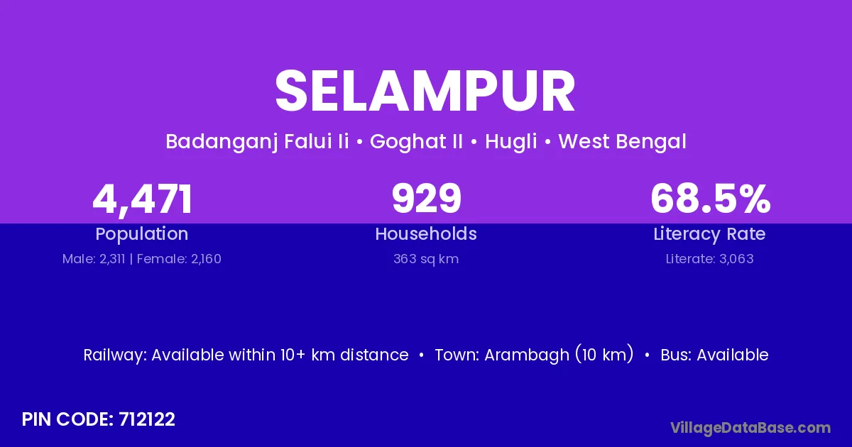 Arambagh (10 km) is the nearest town to Selampur village for major economic activities and is located approximately 10 km away.