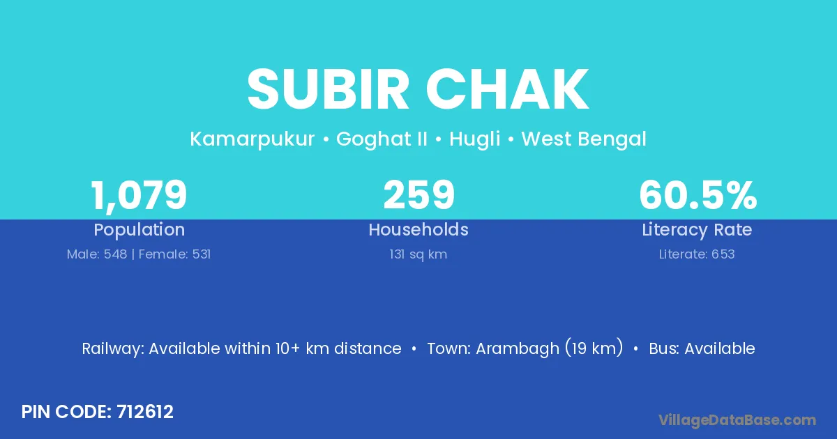 Arambagh (19 km) is the nearest town to Subir Chak village for major economic activities and is located approximately 19 km away.