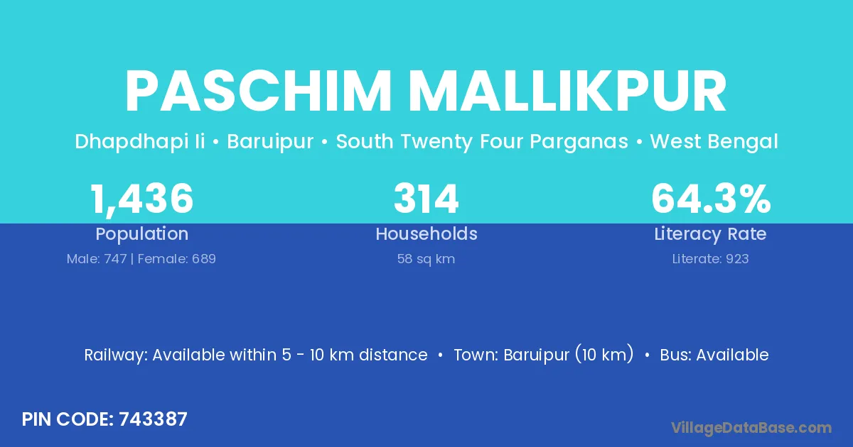 The literacy rate of Paschim Mallikpur village is 65.83%. Male literacy stands at 70.97% and female literacy at 60.51%.