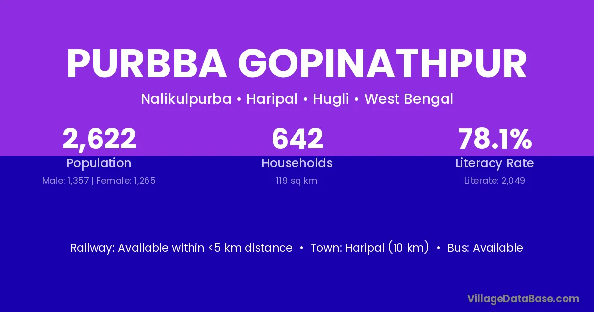 Haripal (10 km) is the nearest town to Purbba Gopinathpur village for major economic activities and is located approximately 10 km away.