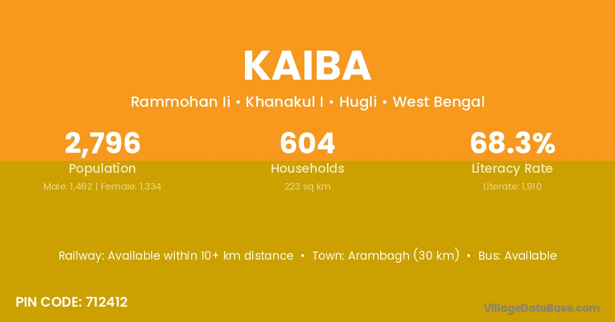 Arambagh (30 km) is the nearest town to Kaiba village for major economic activities and is located approximately 30 km away.