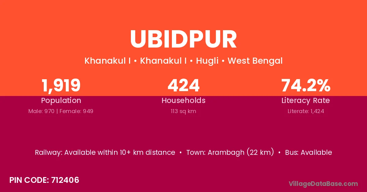 Arambagh (22 km) is the nearest town to Ubidpur village for major economic activities and is located approximately 22 km away.