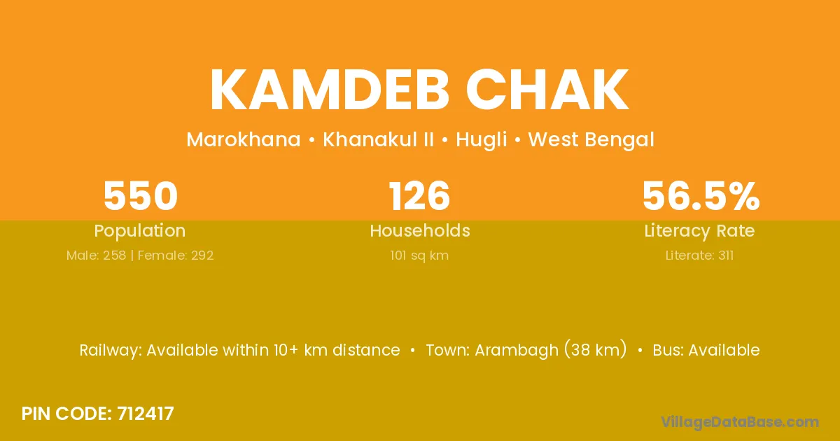Arambagh (38 km) is the nearest town to Kamdeb Chak village for major economic activities and is located approximately 38 km away.
