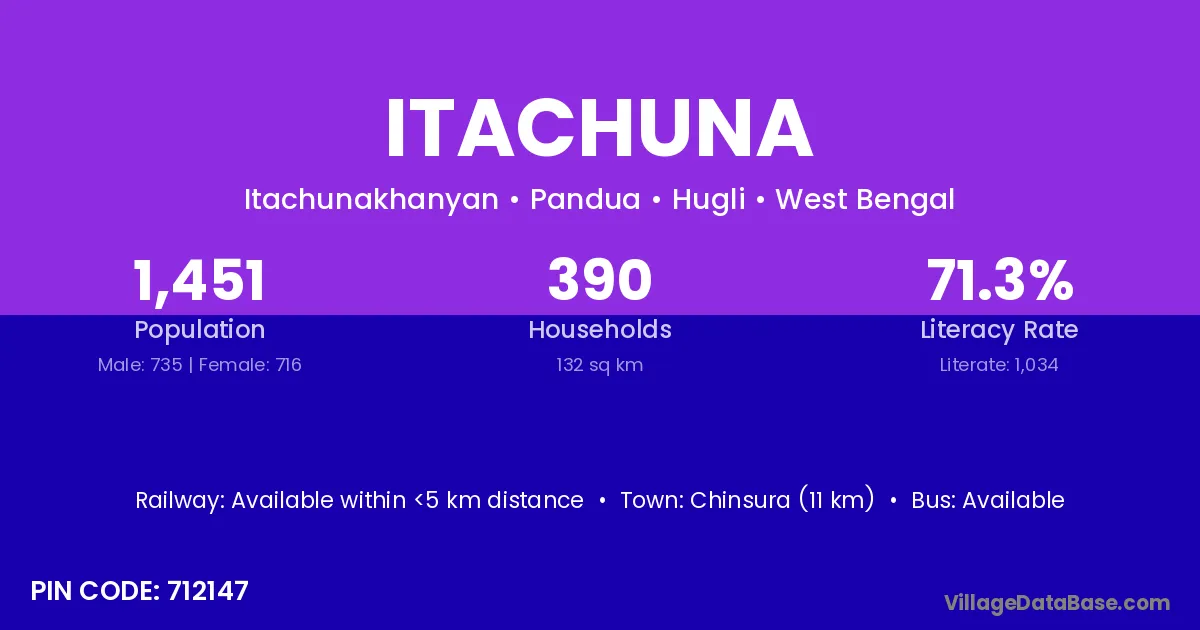 Chinsura (11 km) is the nearest town to Itachuna village for major economic activities and is located approximately 11 km away.