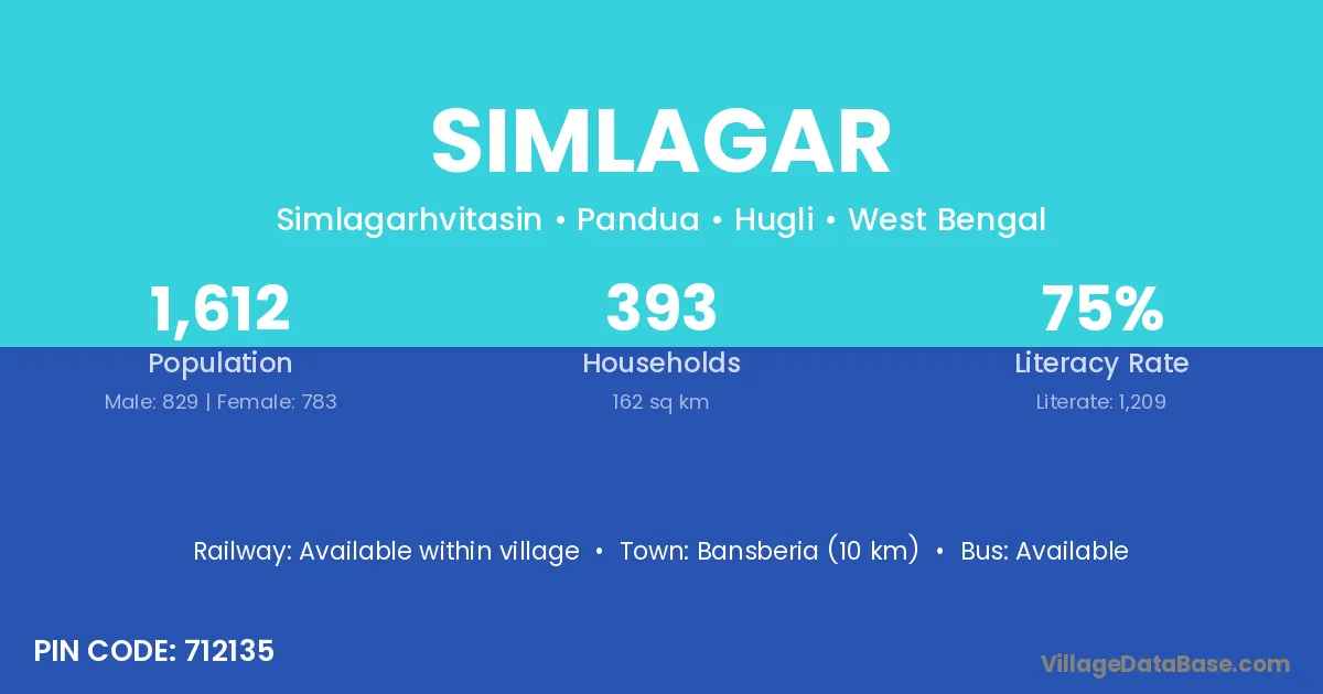 Bansberia (10 km) is the nearest town to Simlagar village for major economic activities and is located approximately 10 km away.