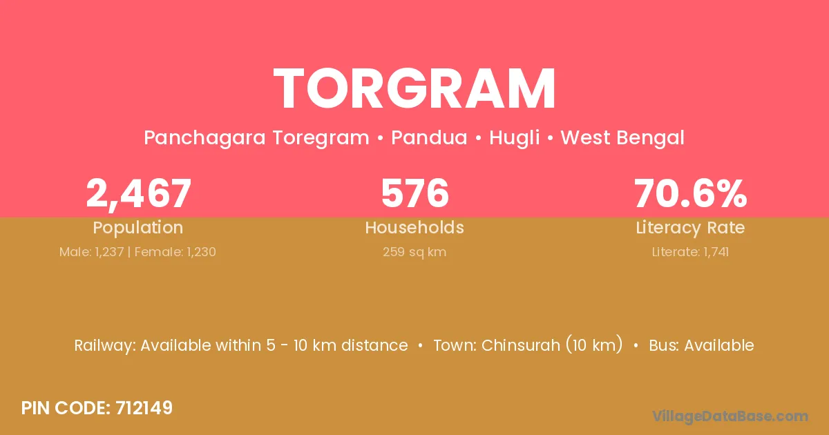 Chinsurah (10 km) is the nearest town to Torgram village for major economic activities and is located approximately 10 km away.