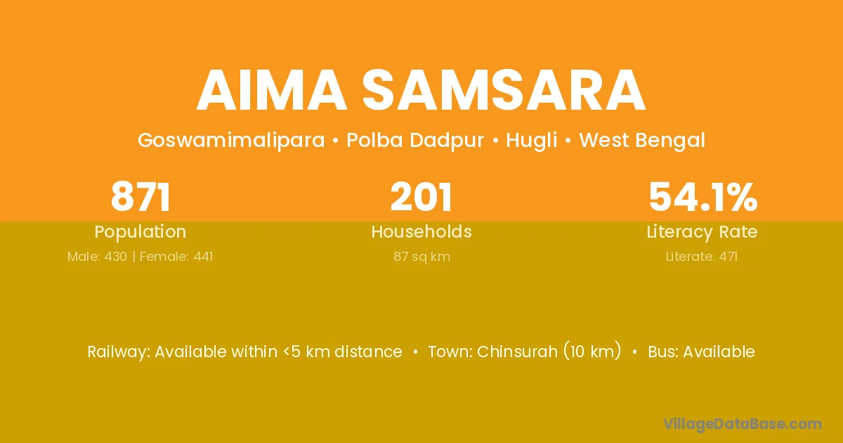 Chinsurah (10 km) is the nearest town to Aima Samsara village for major economic activities and is located approximately 10 km away.