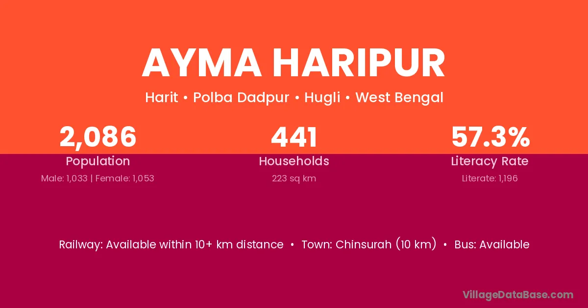 Chinsurah (10 km) is the nearest town to Ayma Haripur village for major economic activities and is located approximately 10 km away.