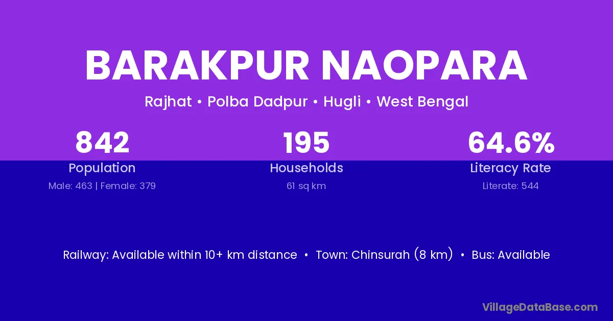 Chinsurah (8 km) is the nearest town to Barakpur Naopara village for major economic activities and is located approximately 8 km away.