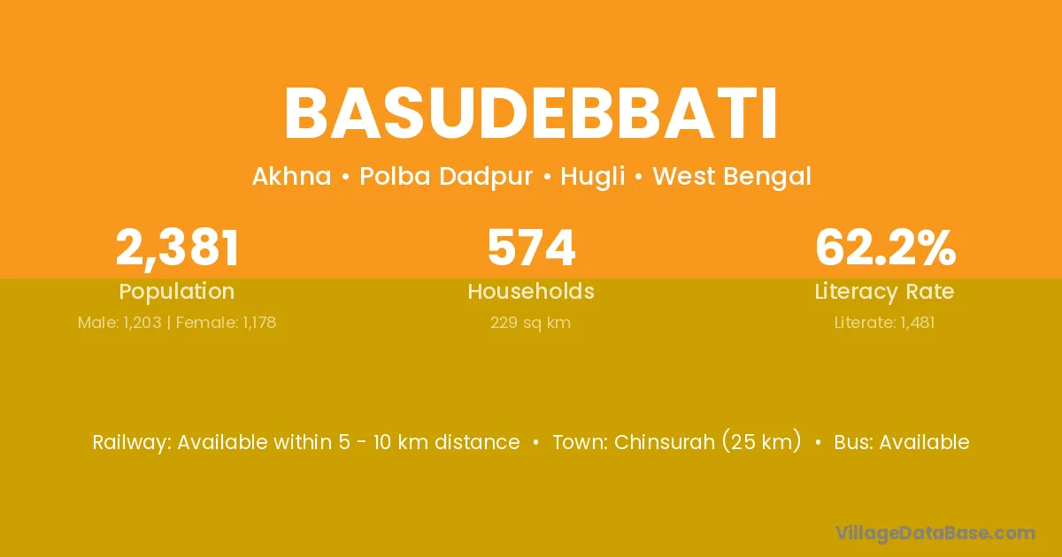 Chinsurah (25 km) is the nearest town to Basudebbati village for major economic activities and is located approximately 25 km away.