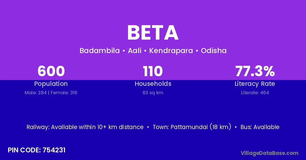 The literacy rate of Beta village is 63.87%. Male literacy stands at 66.09% and female literacy at 61.81%.