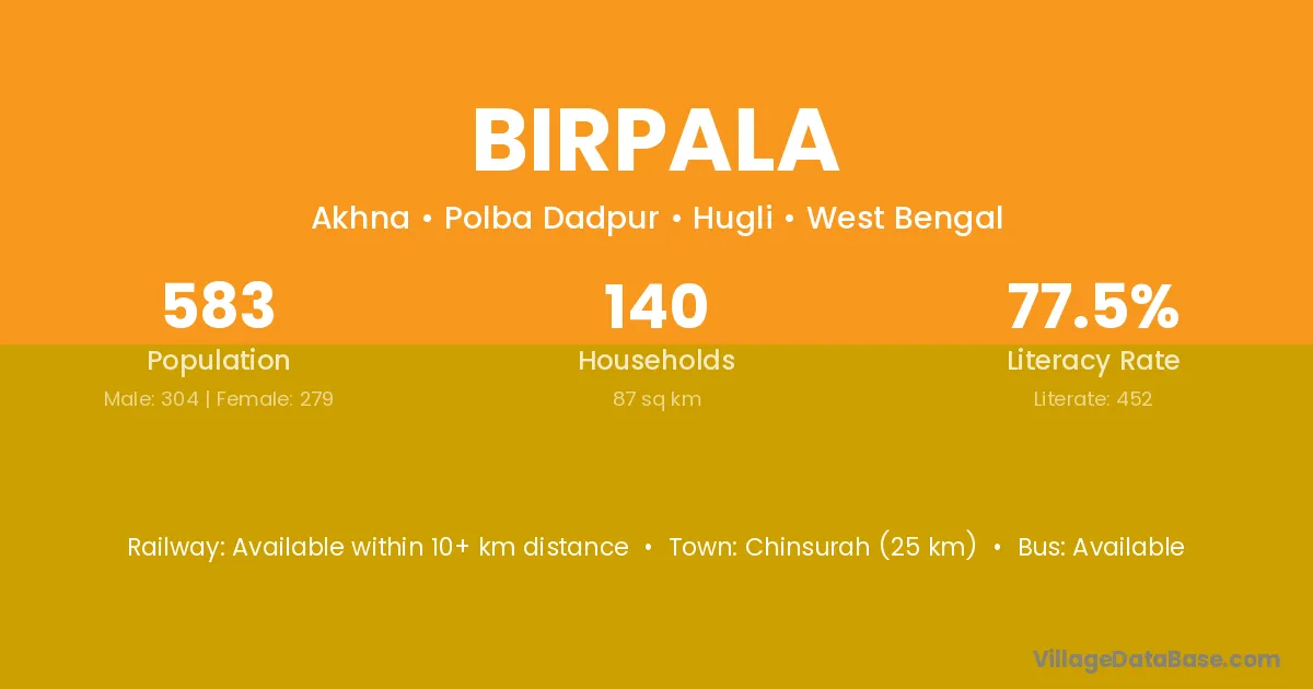 Chinsurah (25 km) is the nearest town to Birpala village for major economic activities and is located approximately 25 km away.