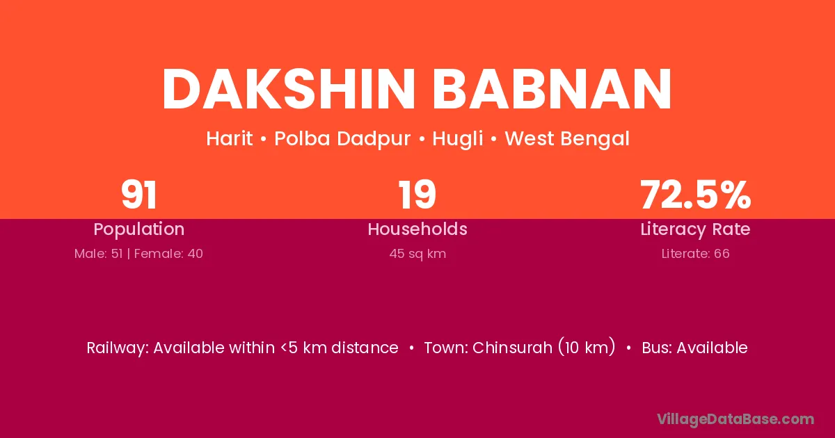 Chinsurah (10 km) is the nearest town to Dakshin Babnan village for major economic activities and is located approximately 10 km away.