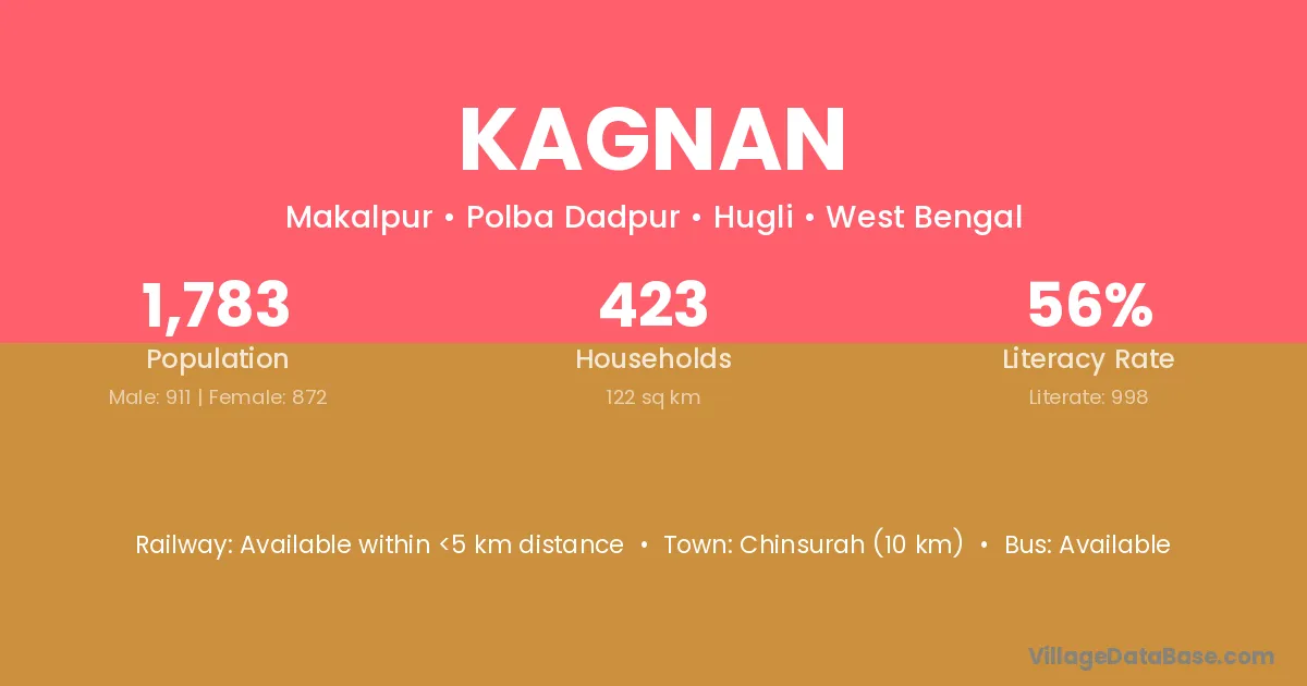 Chinsurah (10 km) is the nearest town to Kagnan village for major economic activities and is located approximately 10 km away.