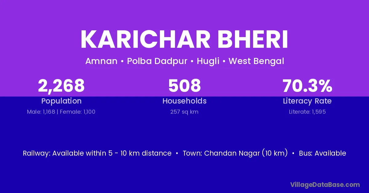 Chandan Nagar (10 km) is the nearest town to Karichar Bheri village for major economic activities and is located approximately 10 km away.