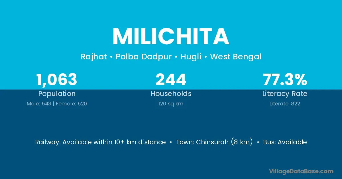 Chinsurah (8 km) is the nearest town to Milichita village for major economic activities and is located approximately 8 km away.