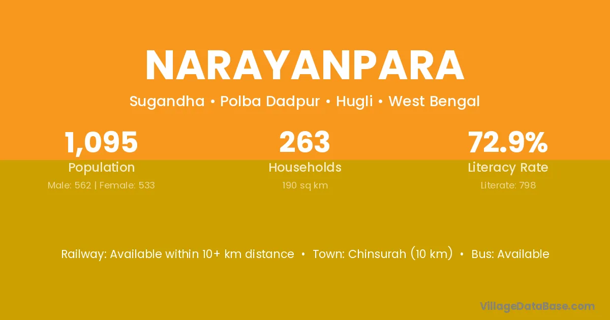 Chinsurah (10 km) is the nearest town to Narayanpara village for major economic activities and is located approximately 10 km away.