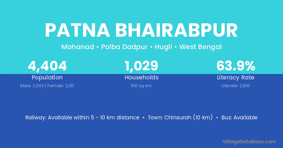 Chinsurah (10 km) is the nearest town to Patna Bhairabpur village for major economic activities and is located approximately 10 km away.