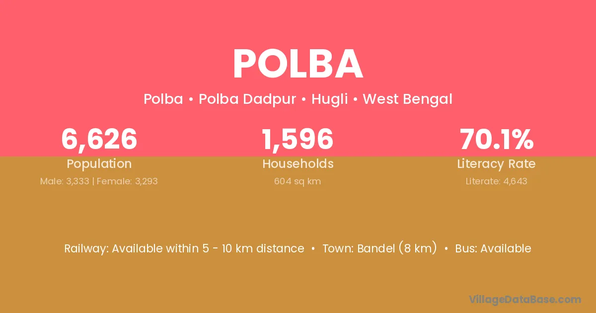 Bandel (8 km) is the nearest town to Polba village for major economic activities and is located approximately 8 km away.