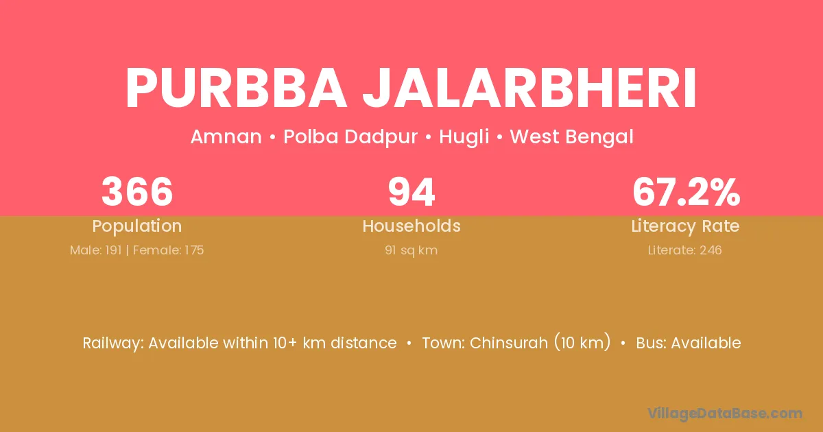 Chinsurah (10 km) is the nearest town to Purbba Jalarbheri village for major economic activities and is located approximately 10 km away.