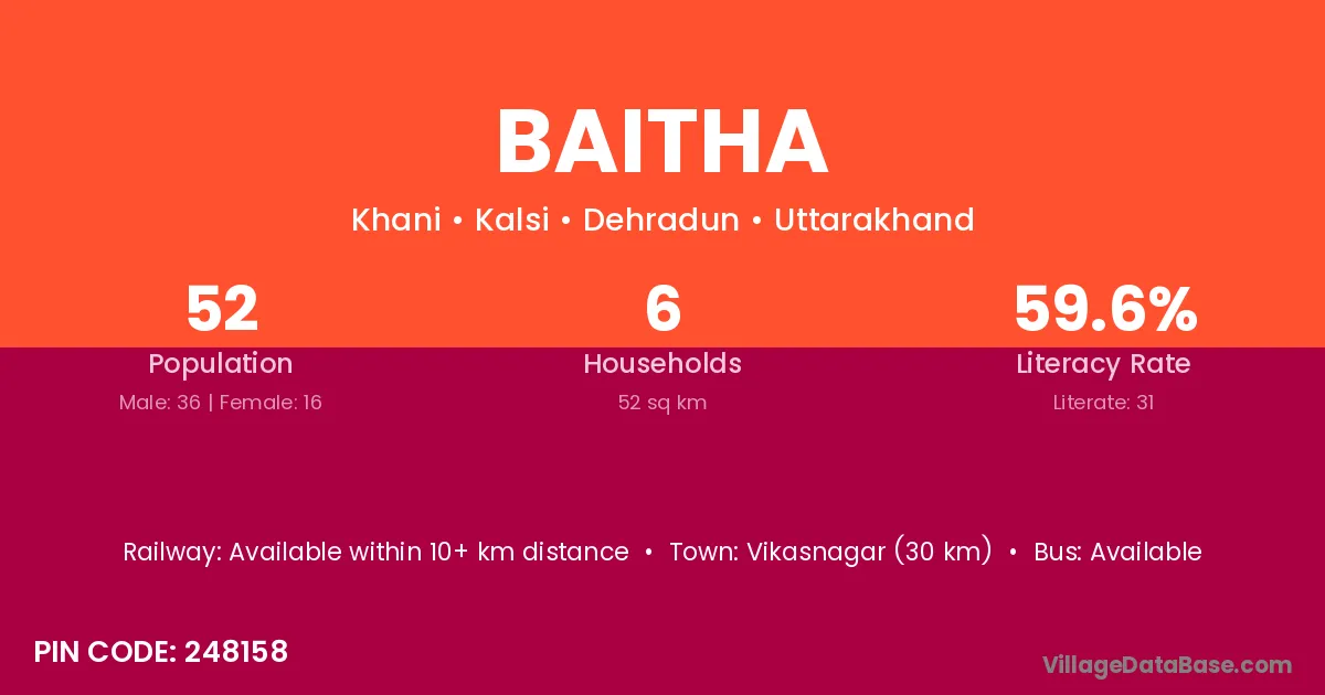 The literacy rate of Baitha village is 67.10%. Male literacy stands at 77.57% and female literacy at 56.39%.