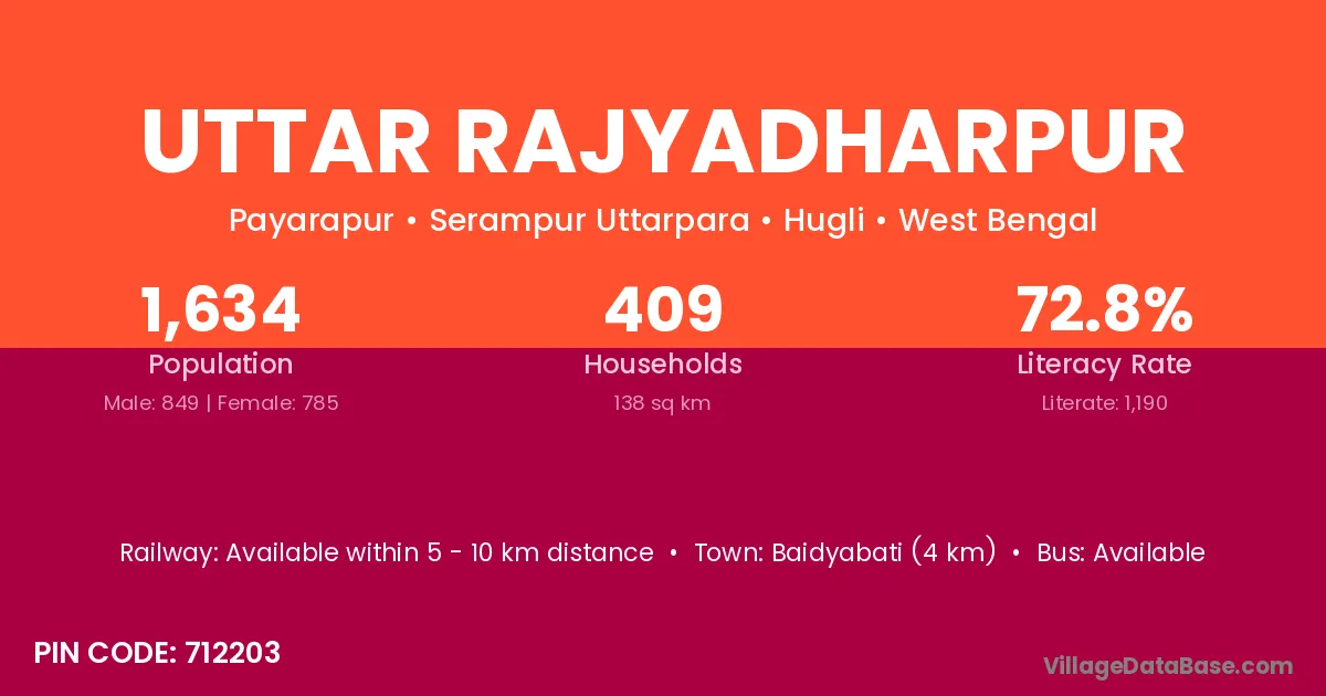 Baidyabati (4 km) is the nearest town to Uttar Rajyadharpur village for major economic activities and is located approximately 4 km away.
