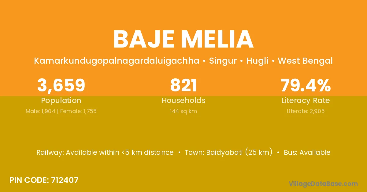 Baidyabati (25 km) is the nearest town to Baje Melia village for major economic activities and is located approximately 25 km away.